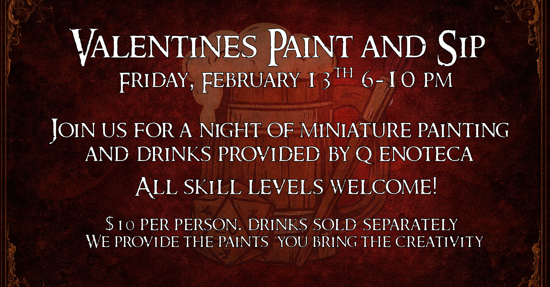 $15 gets you into a night of painting our collection of creepy crawlers and spooky minis, access to our paint collection to use to paint your model as well as any help you may need from our painting expert Ben!